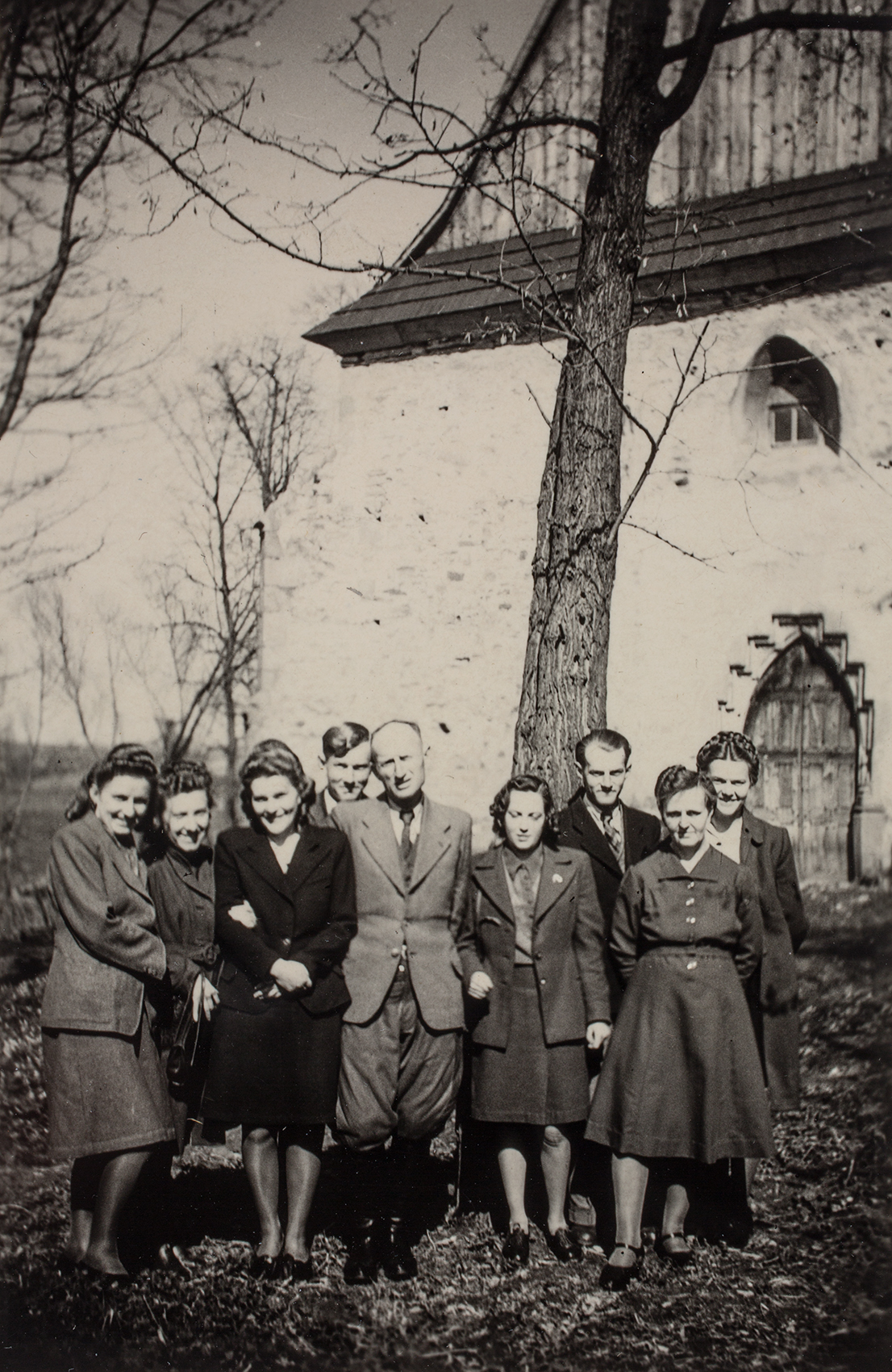 Zdjęcie 012. Józef Laska (piąty od lewej) w towarzystwie nierozpoznanych mężczyzn i kobiet. Na drugim planie XV-wieczny kościół pw. św. Zofii w Bobowej. -