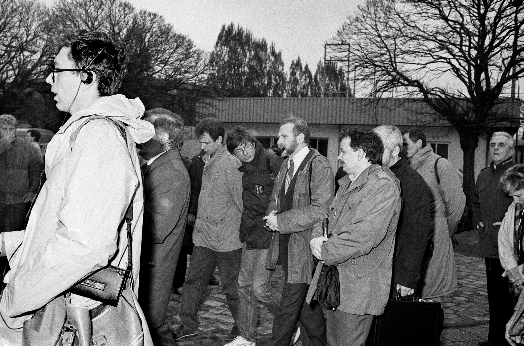 Zdjęcie 014. Pierwsza sesja zdjęciowa (nieudana) Lecha Wałęsy z kandydatami do sejmu i senatu za bramą Stoczni Gdańskiej im. Lenina, 29 kwietnia 1989 r. Na prawo od L. Wałęsy Ryszard Bugaj, kandydat do sejmu z ramienia KO „S”. Po lewej: ks. Henryk Jankowski. Z prawej: Andrzej Wajda, kandydat do senatu z ramienia KO „S” w Suwałkach. Fot. Igor Witowicz.