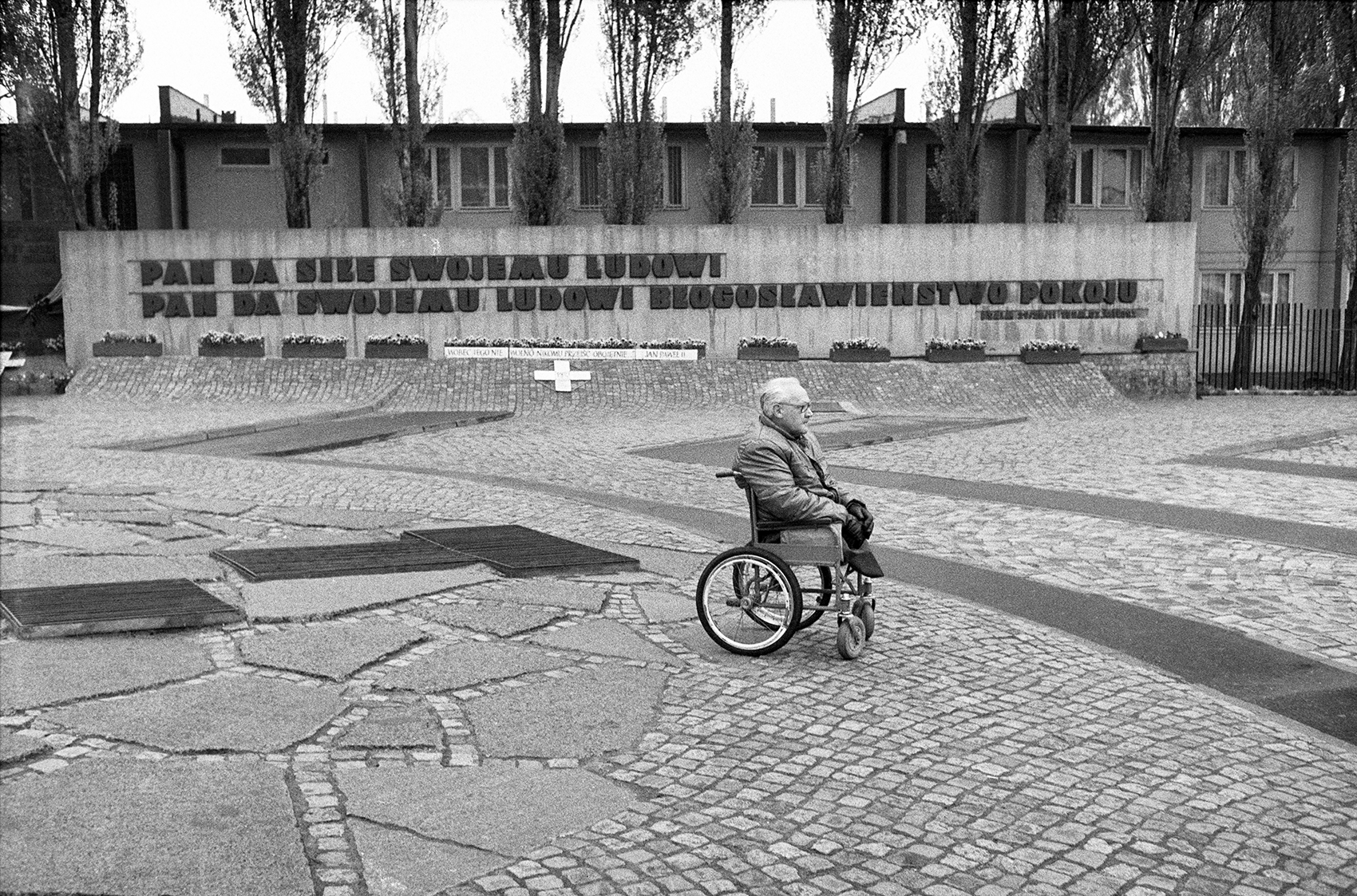 Zdjęcie 007. Mężczyzna na wózku inwalidzkim przy Pomniku Poległych Stoczniowców 1970 w Gdańsku, 29 kwietnia 1989 r. Fot. Igor Witowicz.