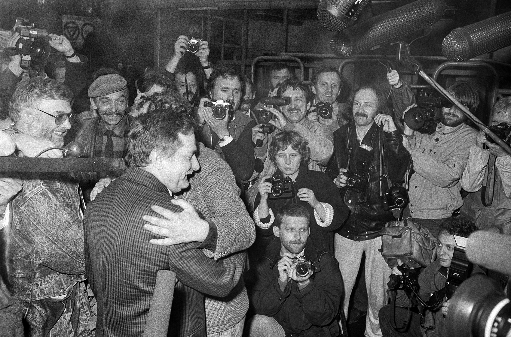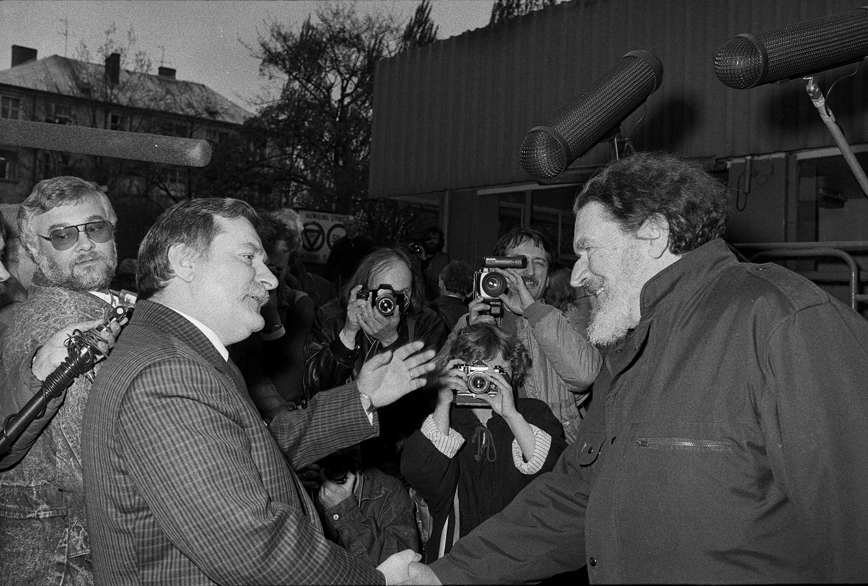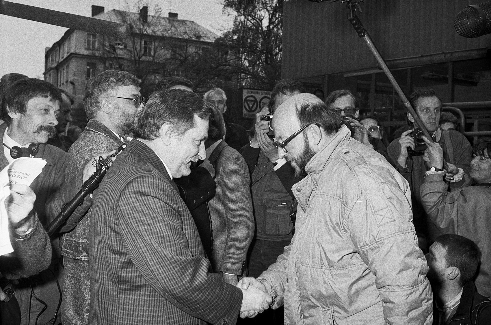 Zdjęcie 009. Pierwsza sesja zdjęciowa (nieudana) Lecha Wałęsy z kandydatami do sejmu i senatu za bramą Stoczni Gdańskiej im. Lenina, 29 kwietnia 1989 r. Na zdjęciu L. Wałęsa wita się z A. Michnikiem, kandydatem do sejmu z ramienia Komitetu Obywatelskiego „Solidarność” w Bytomiu. Od lewej: Krzysztof Pusz i fotografowie, wśród nich Jerzy Kośnik (stoi trzeci z prawej), za A. Michnikiem – Jarosław Maciej Goliszewski, na prawo od niego słabo widoczny Erazm Ciołek. Fot. Igor Witowicz.