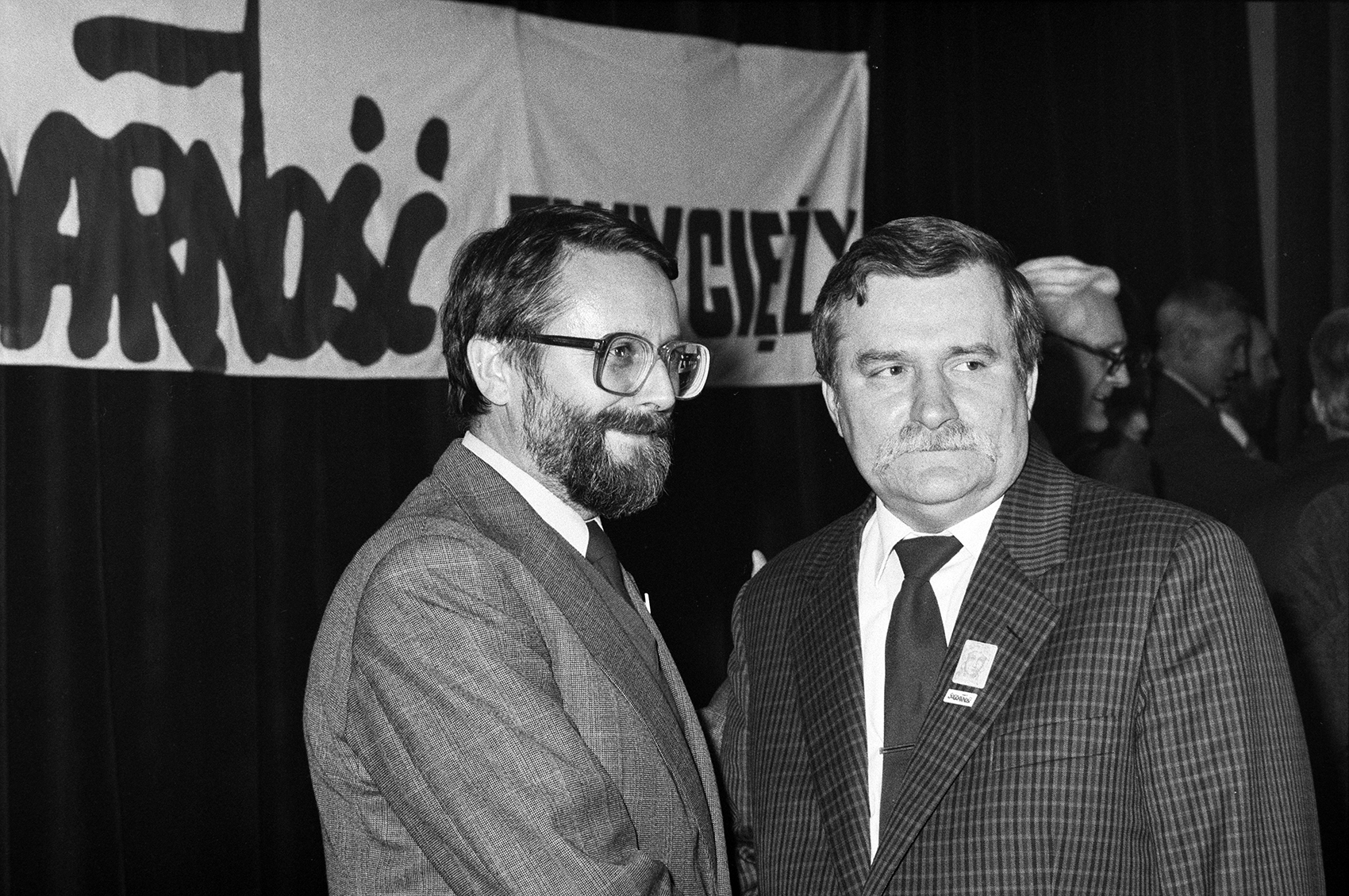 Zdjęcie 038. Sesja zdjęciowa Lecha Wałęsy z kandydatami do sejmu i senatu w Sali BHP Stoczni Gdańskiej im. Lenina 29 kwietnia 1989 r. Lech Wałęsa z Adamem Matuszczakiem, kandydatem do sejmu z ramienia KO „S” w Rzeszowie. Fot. Igor Witowicz.