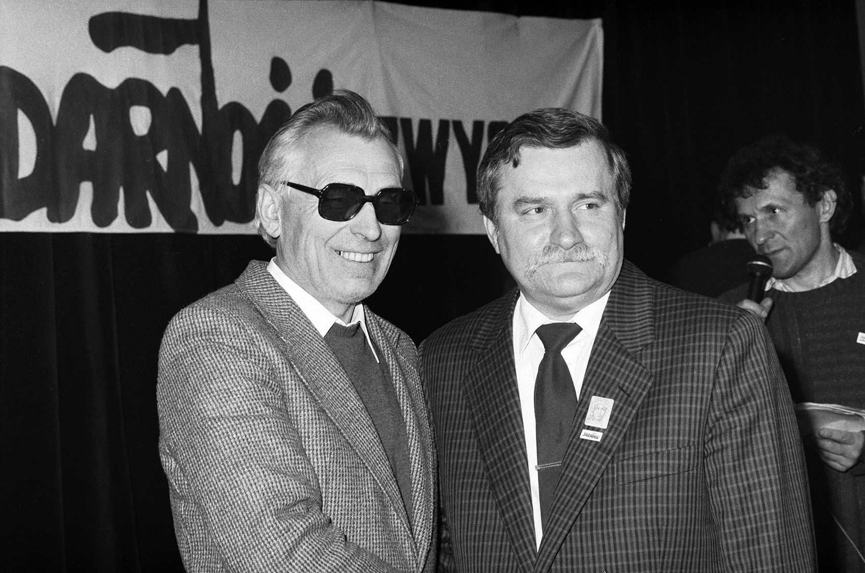 Zdjęcie 032. Gustaw Holoubek, kandydat do senatu z ramienia KO „S” w Krośnie podczas spotkania Lecha Wałęsy z kandydatami do sejmu i senatu w Sali BHP Stoczni Gdańskiej im. Lenina 29 kwietnia 1989 r. Na lewo od niego: Jerzy Osiatyński, kandydat do sejmu z ramienia KO „S”. Fot. Igor Witowicz.