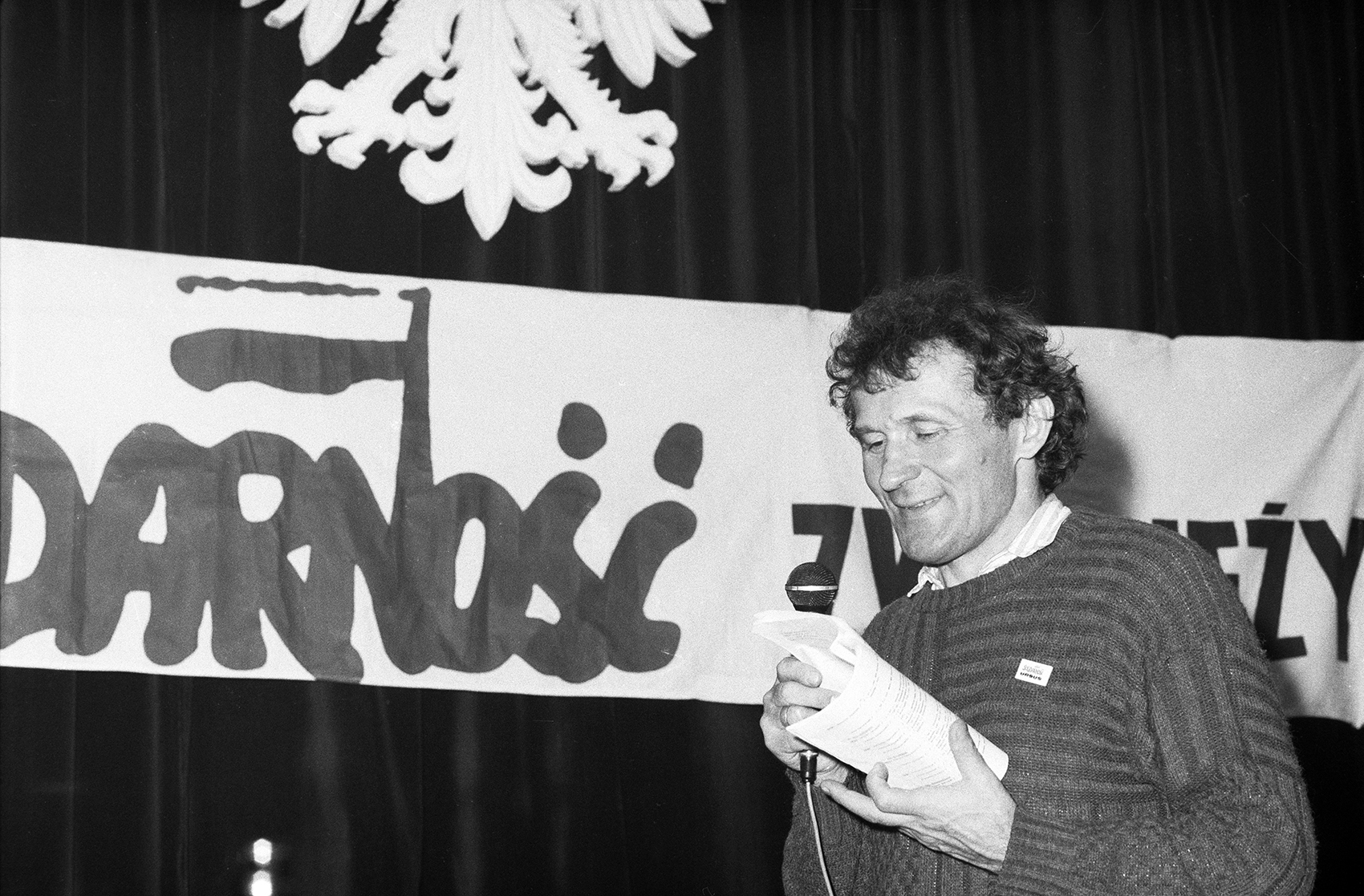 Zdjęcie 029. Kandydaci do sejmu i senatu w Sali BHP Stoczni Gdańskiej im. Lenina 29 kwietnia 1989 r. Przemawia Edmund Osmańczyk, kandydat do senatu z ramienia KO „S”. Fot. Igor Witowicz.