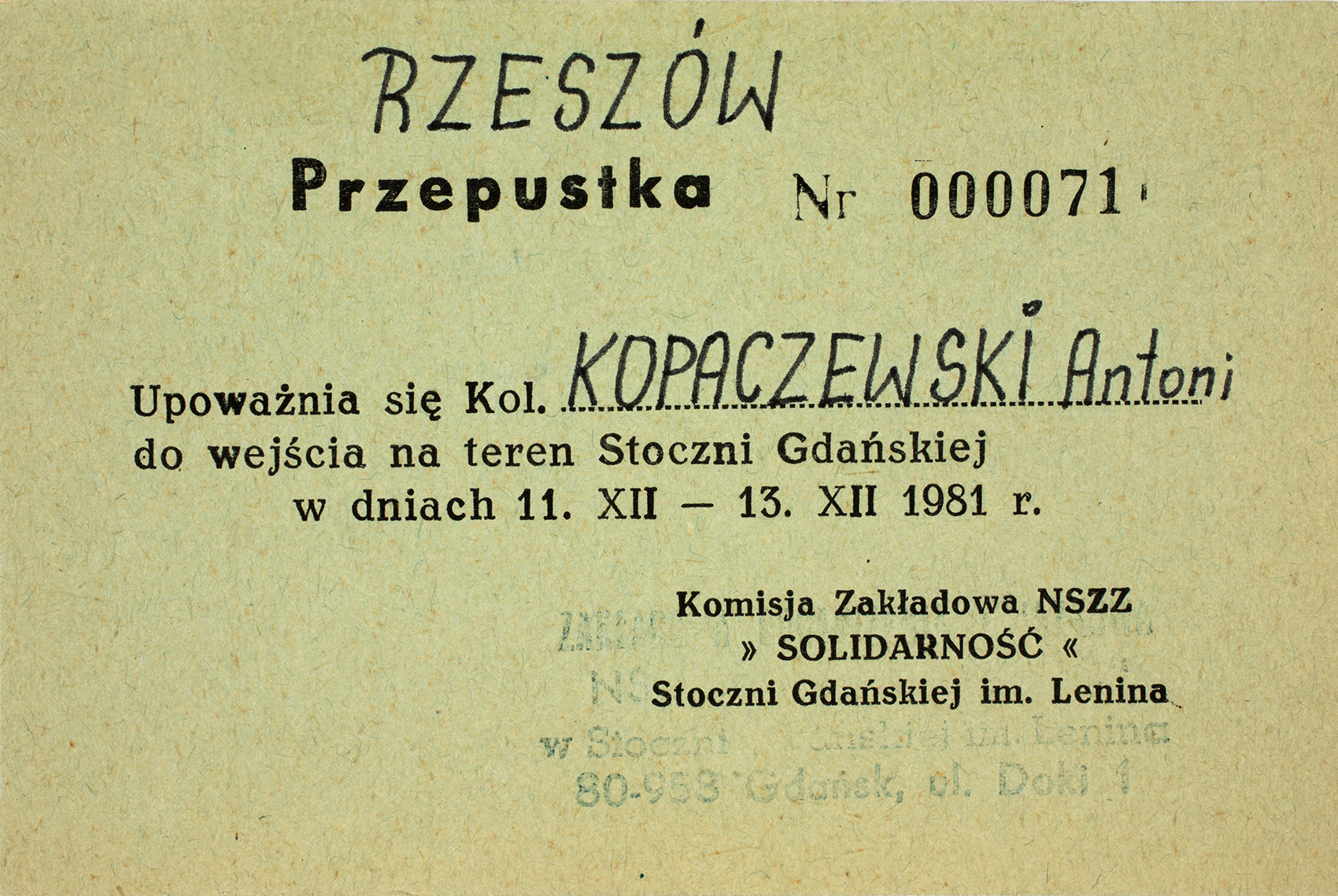 Zdjęcie 026. Przepustka upoważniająca A. Kopaczewskiego do wejścia na teren Stoczni Gdańskiej w dniach od 11 do 13 grudnia 1981 r.
