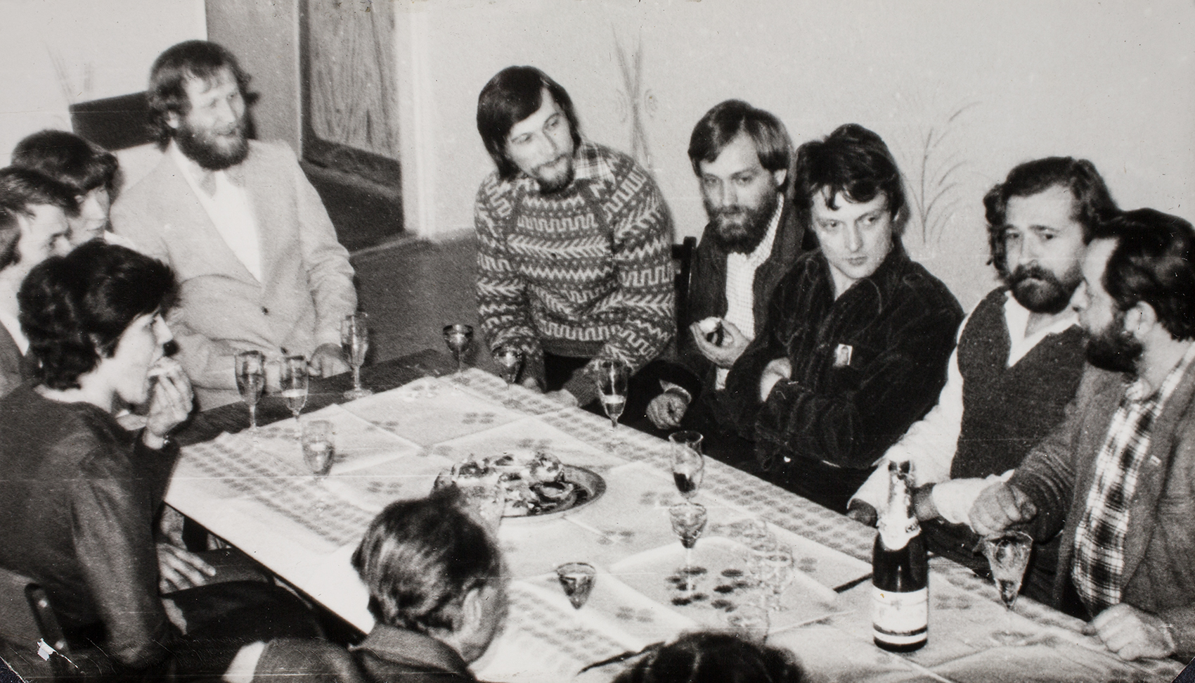 Zdjęcie 028. Ślub Kazimierza Kochanowicza z Alicją Szubart w więzieniu w Załężu, w kwietniu 1982 r. W jasnym garniturze Kazimierz Kochanowicz, obok jego żona Alicja i świadkowie. Na prawo od K. Kochanowicza: Jacek Rząsa, Adam Śnieżek, Tadeusz Kensy, Zbigniew Sowa i Antoni Kopaczewski – działacze NSZZ „S” internowani w tzw. Ośrodku Odosobnienia w Załężu.