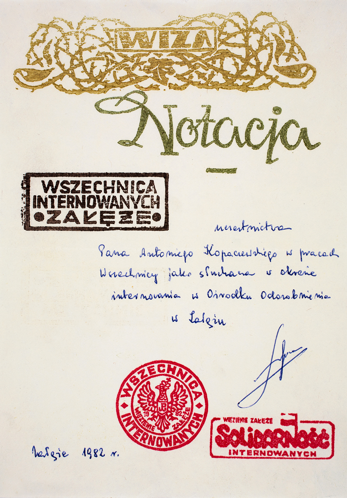 Zdjęcie 031. Pamiątka uczestnictwa A. Kopaczewskiego w pracach Wszechnicy Internowanych, Załęże 1982.