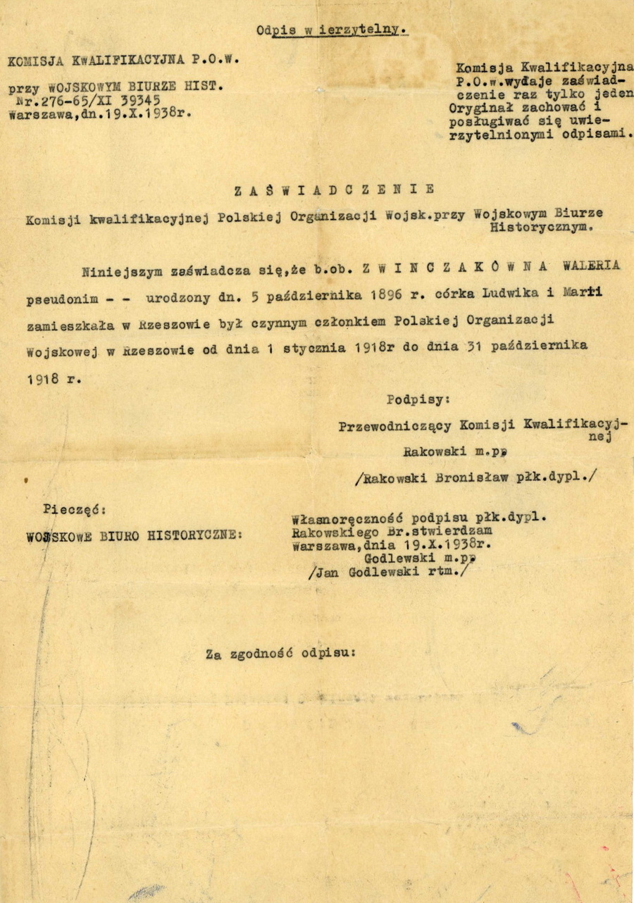 Zaświadczenie Komisji Kwalifikacyjnej Polskiej Organizacji Wojskowej przy Wojskowym Biurze Historycznym z 19.10.1938 r. stwierdzające, że Waleria Zwinczakówna, córka Ludwika i Marii, ur. 05.10.1896 r. była czynnym członkiem POW w Rzeszowie w okresie od 01.01.1918 r. do 31.10.1918 r. -