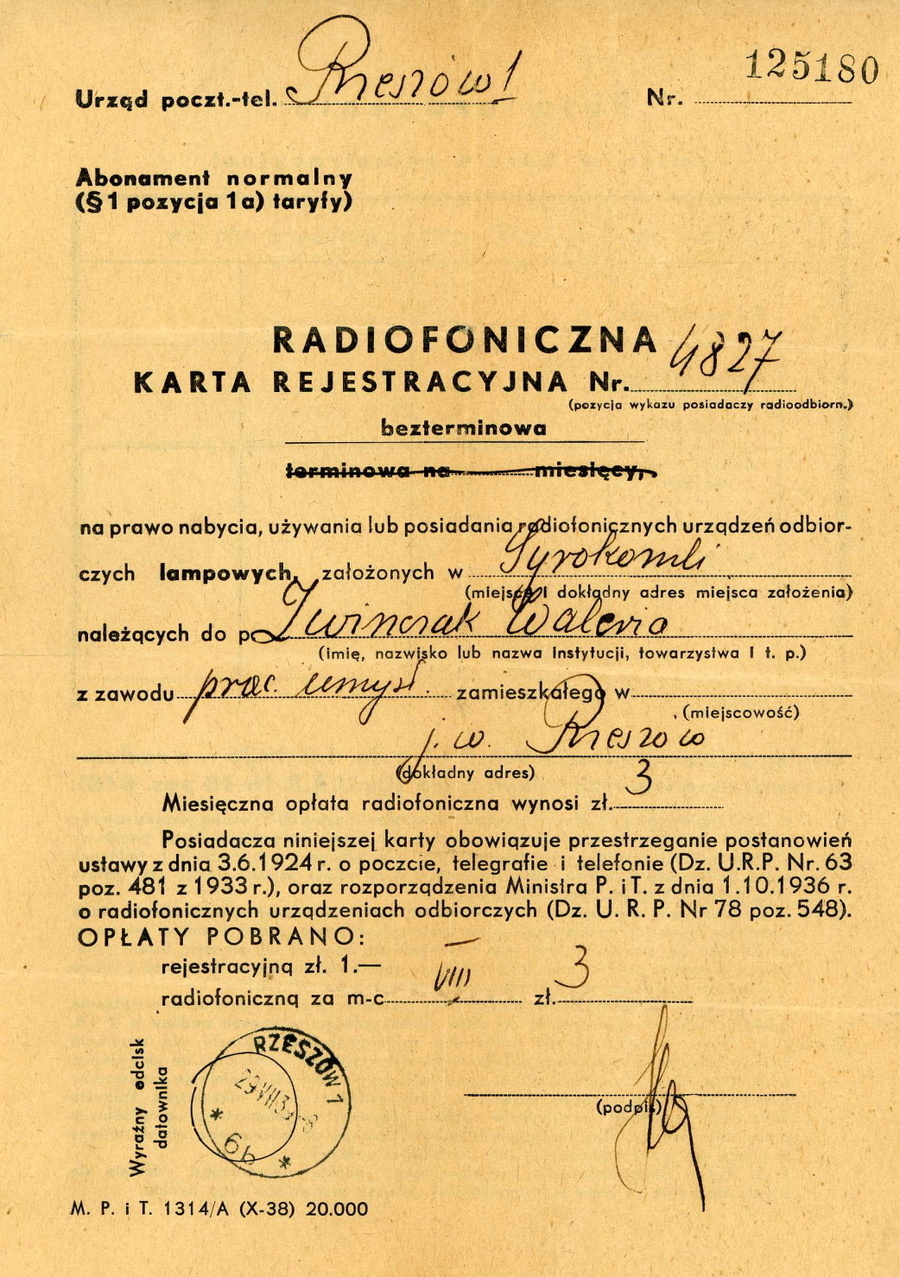 - Radiofoniczna karta rejestracyjna, wystawiona w lipcu 1939 r. przez Urząd Pocztowo-Telefoniczny Rzeszów na nazwisko: Waleria Zwinczak;