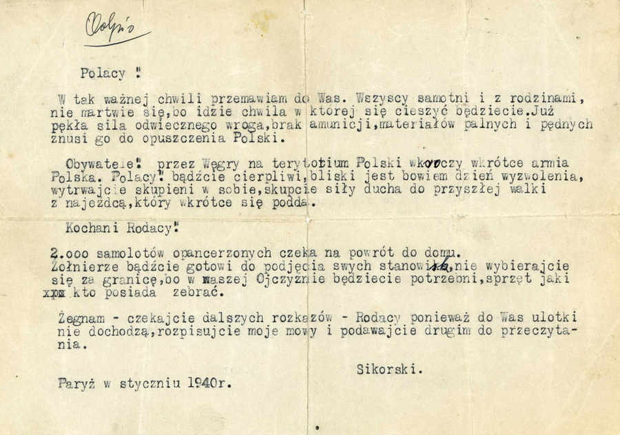 - Odpis odezwy gen. Sikorskiego skierowanej do Polaków w Paryżu w styczniu 1940 r.